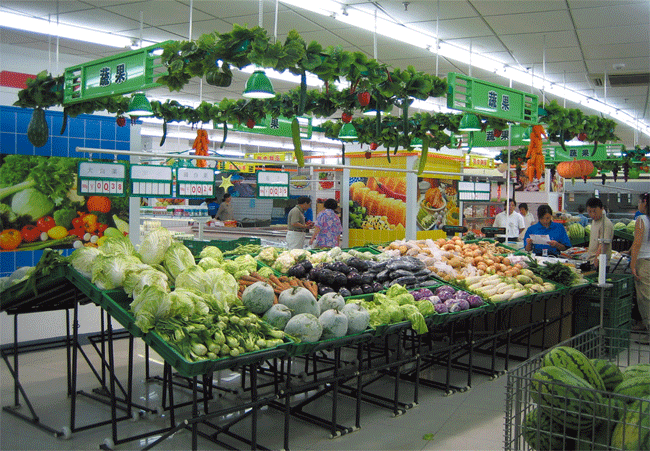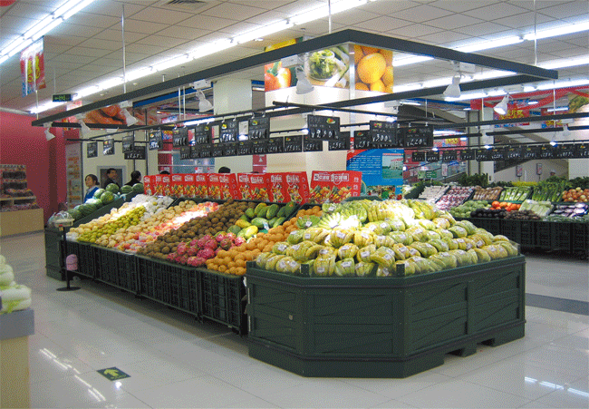 金港华生产的金属蔬果架角度,长度可调,折叠方便。整体衔接完美,对美味水果有非常好的烘托作用。金港华产品品类繁多,尤其擅长根据卖场需要设计新品,尽情展示卖场生鲜区蔬果丰收的田园风格。